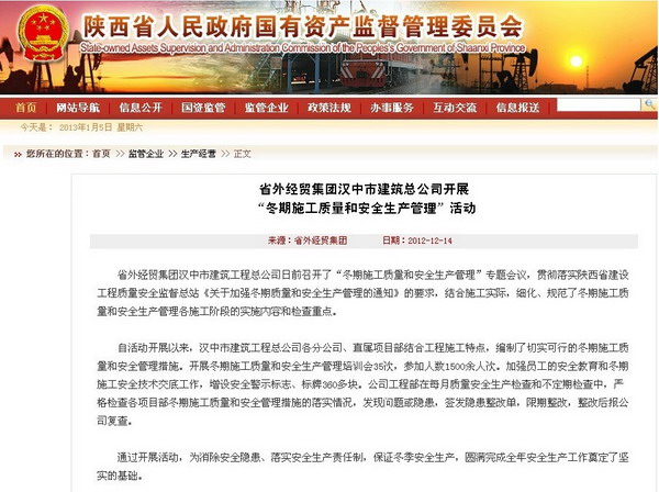 省國資委網(wǎng)站轉(zhuǎn)載:集團漢建總公司開展“冬期施工質(zhì)量和安全生產(chǎn)管理”活動