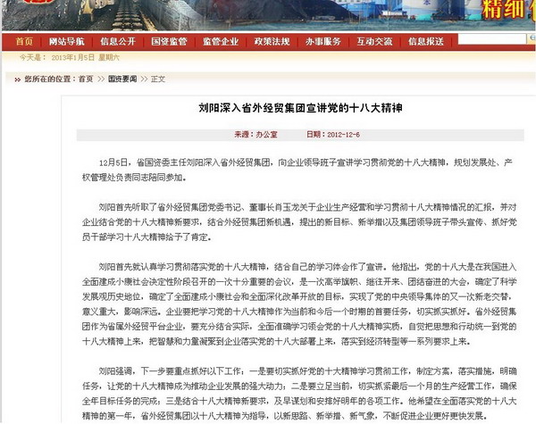 省國資委網(wǎng)站轉(zhuǎn)載:劉陽主任深入省外經(jīng)貿(mào)集團(tuán)宣講黨的十八大精神