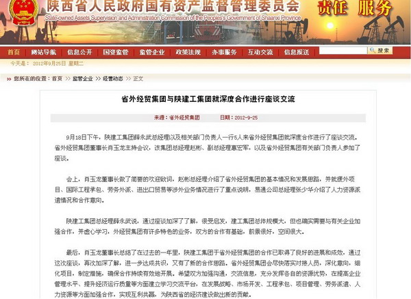 省國資委網(wǎng)站登載:省外經(jīng)貿(mào)集團與陜建工集團就深度合作進行座談交流