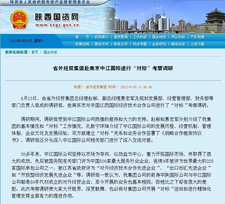 省國(guó)資委網(wǎng)站登載:省外經(jīng)貿(mào)集團(tuán)赴南京中江國(guó)際進(jìn)行“對(duì)標(biāo)”考察調(diào)研