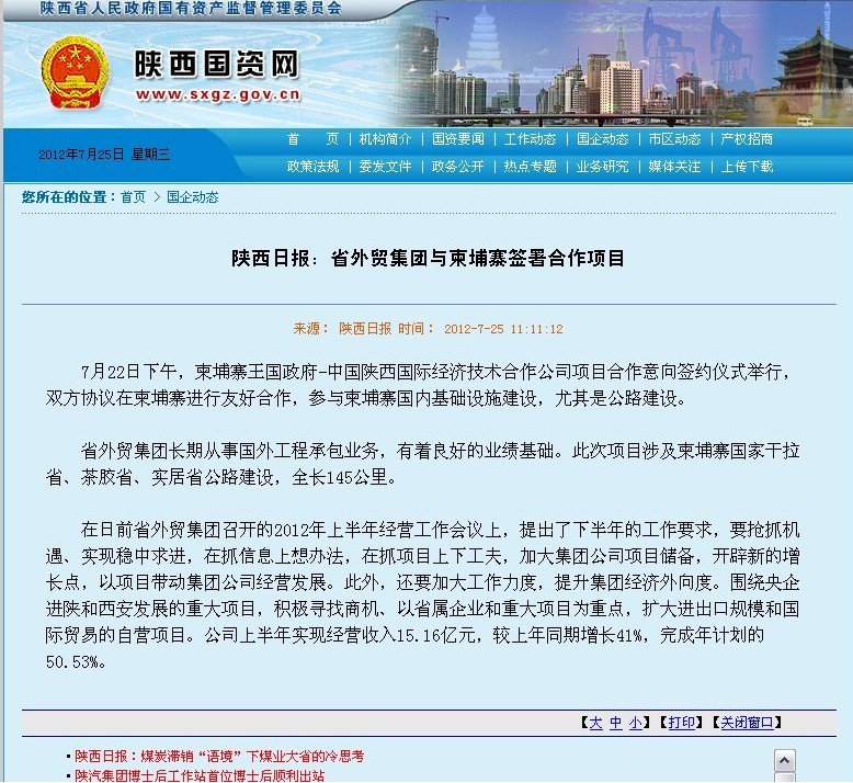 省國資委網(wǎng)站登載:陜西日報(bào)刊登省外經(jīng)貿(mào)集團(tuán)與柬埔寨簽署合作項(xiàng)目