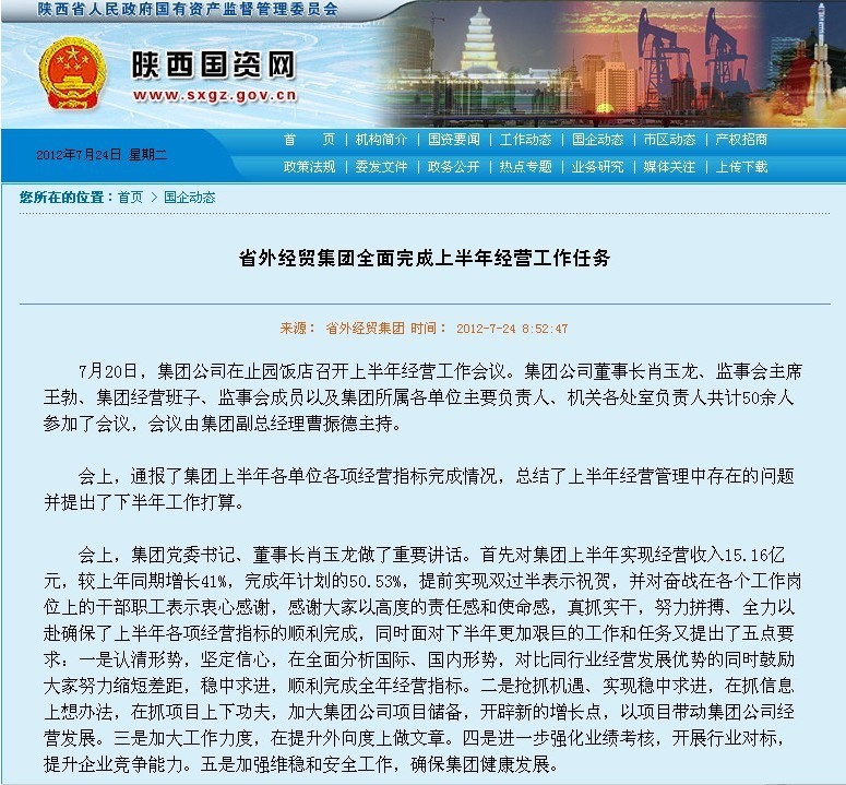 省國資委網(wǎng)站登載:省外經(jīng)貿(mào)集團(tuán)全面完成上半年經(jīng)營工作任務(wù)
