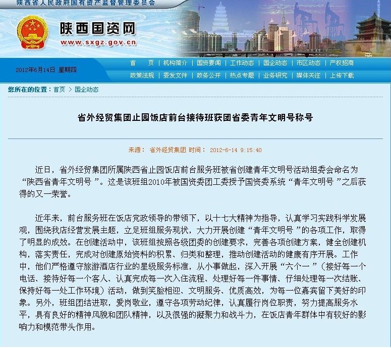 省國資委登載:省外經(jīng)貿(mào)集團(tuán)止園飯店前臺接待班獲團(tuán)省委青年文明號稱號