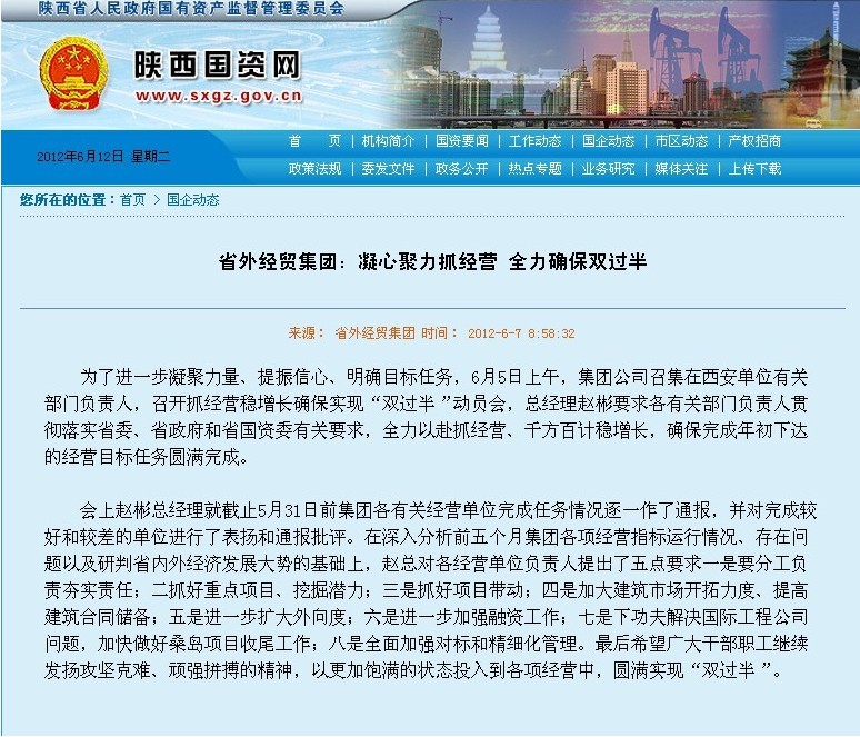 省國(guó)資委網(wǎng)站登載:省外經(jīng)貿(mào)集團(tuán)凝心聚力抓經(jīng)營(yíng) 全力確保雙過(guò)半