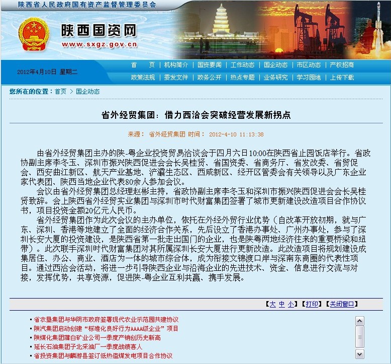 省國(guó)資委網(wǎng)站登載:省外經(jīng)貿(mào)集團(tuán)借力西洽會(huì)突破經(jīng)營(yíng)發(fā)展新拐點(diǎn)