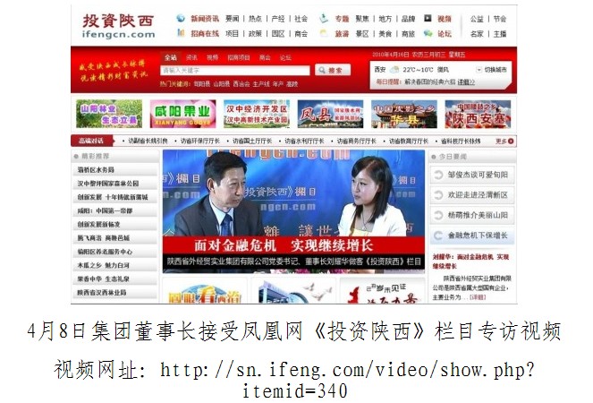 4月15日鳳凰網(wǎng)站《投資陜西》欄目登載集團(tuán)公司董事長(zhǎng)劉耀華接受采訪視頻