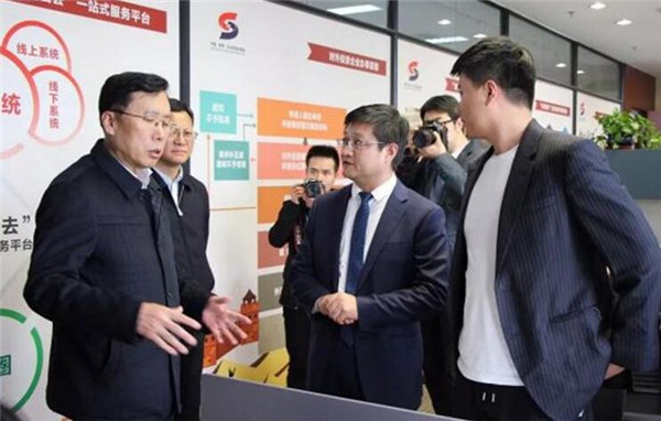 在陜西省“走出去”一站式服務(wù)平臺的啟動儀式上,陜西省外經(jīng)貿(mào)綜合服務(wù)有限公司董事長劉國強(qiáng)(右三)向陜西省副省長魏增軍(左一)詳細(xì)介紹平臺的線上構(gòu)架、服務(wù)內(nèi)容以及運(yùn)營規(guī)劃等情況。